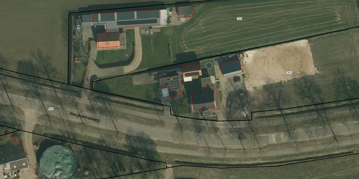 Het perceel waarop Berghemseweg 14-MZ staat heeft een oppervlakte van 4965 m². Dit is een zeer groot perceel. De perceeloppervlakte wordt geregistreerd door het Kadaster. Gedetailleerde informatie over de maten van dit perceel kunt u vinden in het rapport Kadastrale kaart met maatvoering van Berghemseweg 14-MZ.