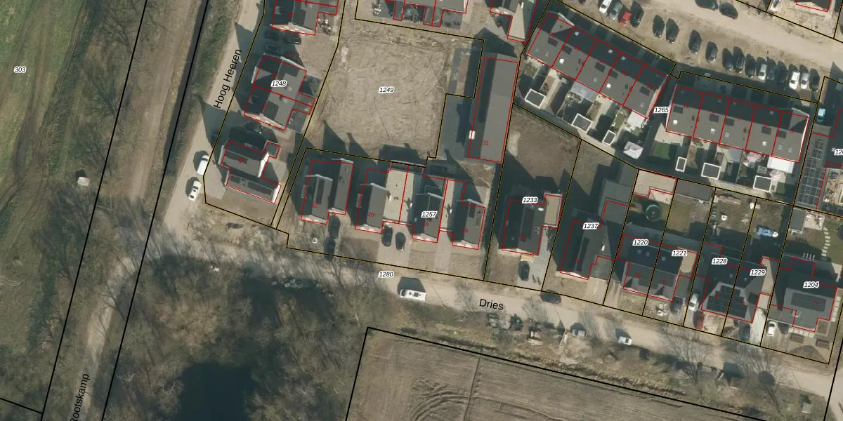 Het perceel waarop Dries 18 staat heeft een oppervlakte van 2485 m². Dit is een zeer groot perceel. De perceeloppervlakte wordt geregistreerd door het Kadaster. Gedetailleerde informatie over de maten van dit perceel kunt u vinden in het rapport Kadastrale kaart met maatvoering van Dries 18.