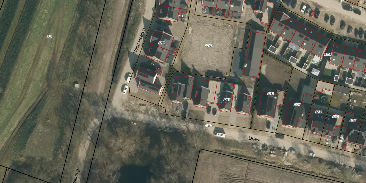 Het perceel waarop Dries 22 staat heeft een oppervlakte van 2485 m². Dit is een zeer groot perceel. De perceeloppervlakte wordt geregistreerd door het Kadaster. Gedetailleerde informatie over de maten van dit perceel kunt u vinden in het rapport Kadastrale kaart met maatvoering van Dries 22.