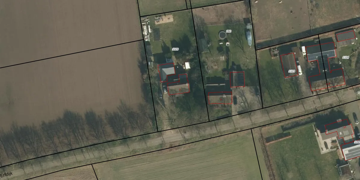 Het perceel waarop Erfdijk 2 staat heeft een oppervlakte van 1875 m². Dit is een zeer groot perceel. De perceeloppervlakte wordt geregistreerd door het Kadaster. Gedetailleerde informatie over de maten van dit perceel kunt u vinden in het rapport Kadastrale kaart met maatvoering van Erfdijk 2.