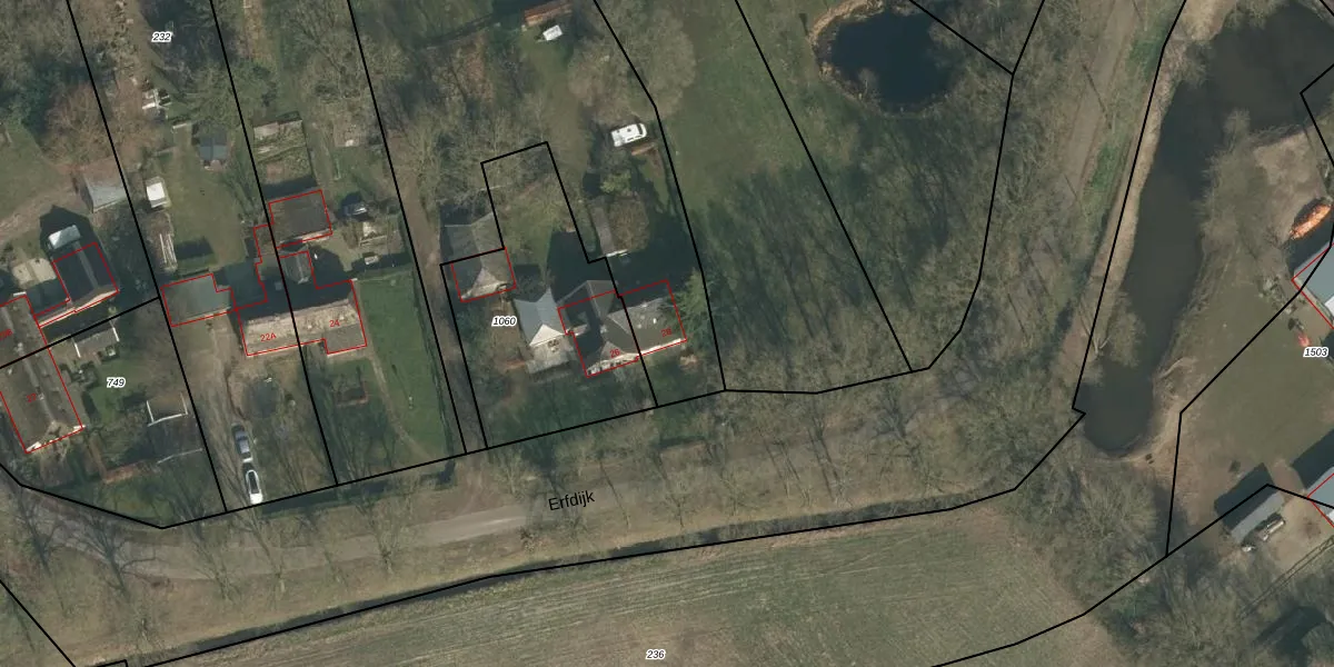 Het perceel waarop Erfdijk 28 staat heeft een oppervlakte van 3056 m². Dit is een zeer groot perceel. De perceeloppervlakte wordt geregistreerd door het Kadaster. Gedetailleerde informatie over de maten van dit perceel kunt u vinden in het rapport Kadastrale kaart met maatvoering van Erfdijk 28.