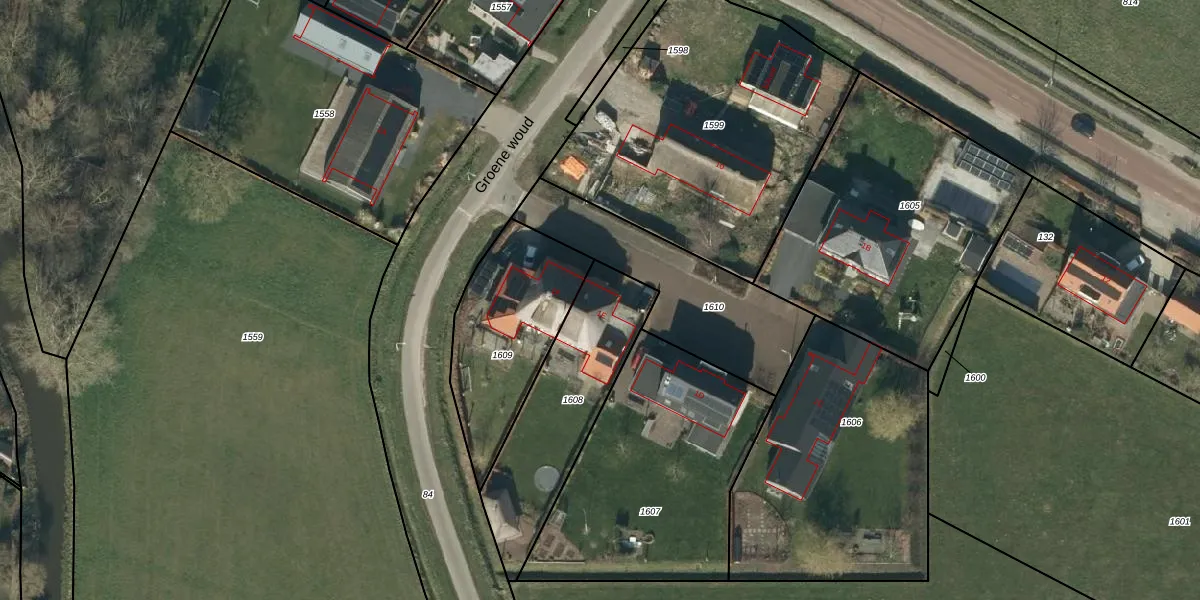 Het perceel waarop Groene woud 1-E staat heeft een oppervlakte van 596 m². Dit is een groot perceel. De perceeloppervlakte wordt geregistreerd door het Kadaster. Gedetailleerde informatie over de maten van dit perceel kunt u vinden in het rapport Kadastrale kaart met maatvoering van Groene woud 1-E.