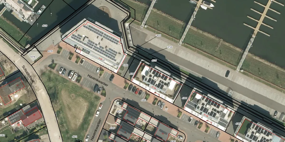 Het perceel waarop Havenkwartier 53 staat heeft een oppervlakte van 635 m². Dit is een groot perceel. De perceeloppervlakte wordt geregistreerd door het Kadaster. Gedetailleerde informatie over de maten van dit perceel kunt u vinden in het rapport Kadastrale kaart met maatvoering van Havenkwartier 53.