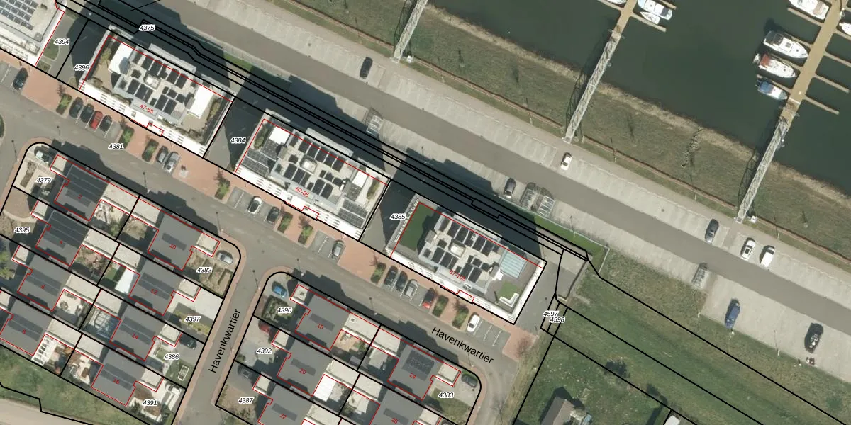 Havenkwartier 87 is gelegen op kadastraal perceel HTN02C4385. Deze kadastrale aanduiding is uniek en wordt gebruikt door het Kadaster om eigendomsrechten en andere zakelijke rechten vast te leggen. Het perceel maakt onderdeel uit van de kadastrale gemeente Herten.