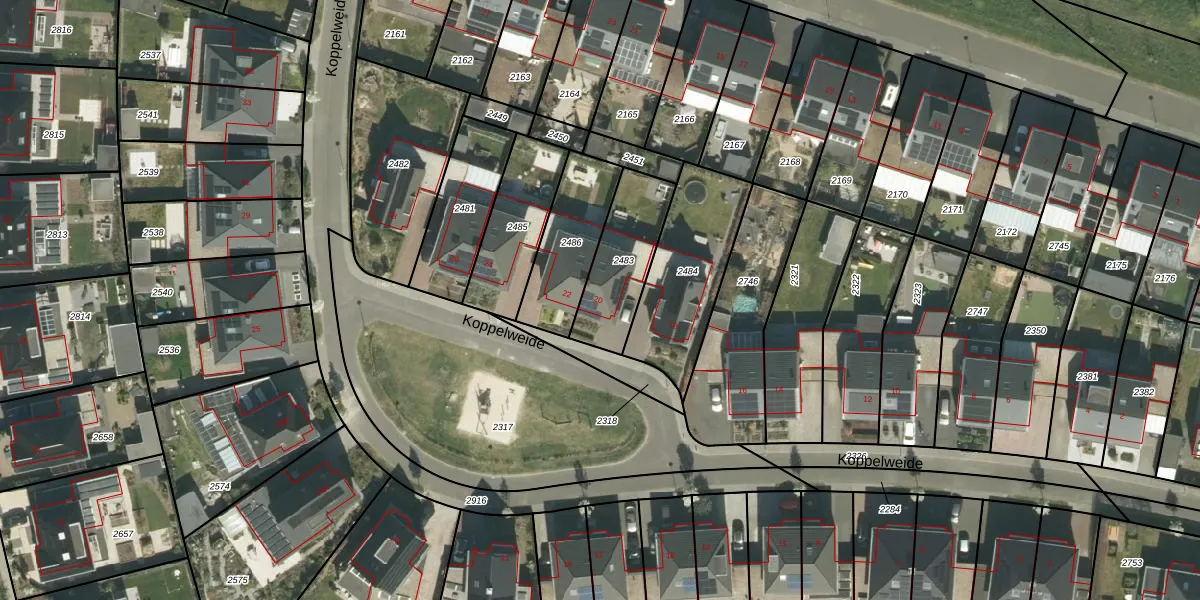 Koppelweide 20 is gelegen op kadastraal perceel HTN02B2483. Deze kadastrale aanduiding is uniek en wordt gebruikt door het Kadaster om eigendomsrechten en andere zakelijke rechten vast te leggen. Het perceel maakt onderdeel uit van de kadastrale gemeente Herten.