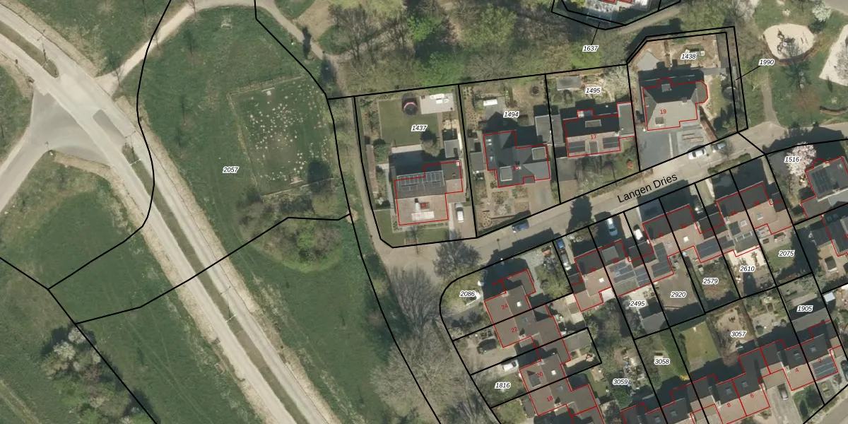 Langen Dries 13 is gelegen op kadastraal perceel HTN02B1437. Deze kadastrale aanduiding is uniek en wordt gebruikt door het Kadaster om eigendomsrechten en andere zakelijke rechten vast te leggen. Het perceel maakt onderdeel uit van de kadastrale gemeente Herten.