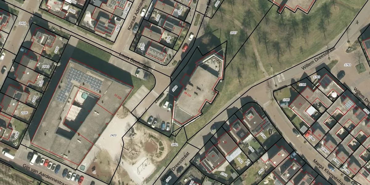 Het perceel waarop Louis Beelstraat 97 staat heeft een oppervlakte van 1121 m². Dit is een zeer groot perceel. De perceeloppervlakte wordt geregistreerd door het Kadaster. Gedetailleerde informatie over de maten van dit perceel kunt u vinden in het rapport Kadastrale kaart met maatvoering van Louis Beelstraat 97.