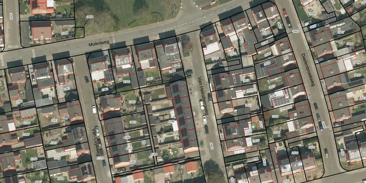 Het perceel waarop Van Heinsbergweg 2 staat heeft een oppervlakte van 1040 m². Dit is een zeer groot perceel. De perceeloppervlakte wordt geregistreerd door het Kadaster. Gedetailleerde informatie over de maten van dit perceel kunt u vinden in het rapport Kadastrale kaart met maatvoering van Van Heinsbergweg 2.