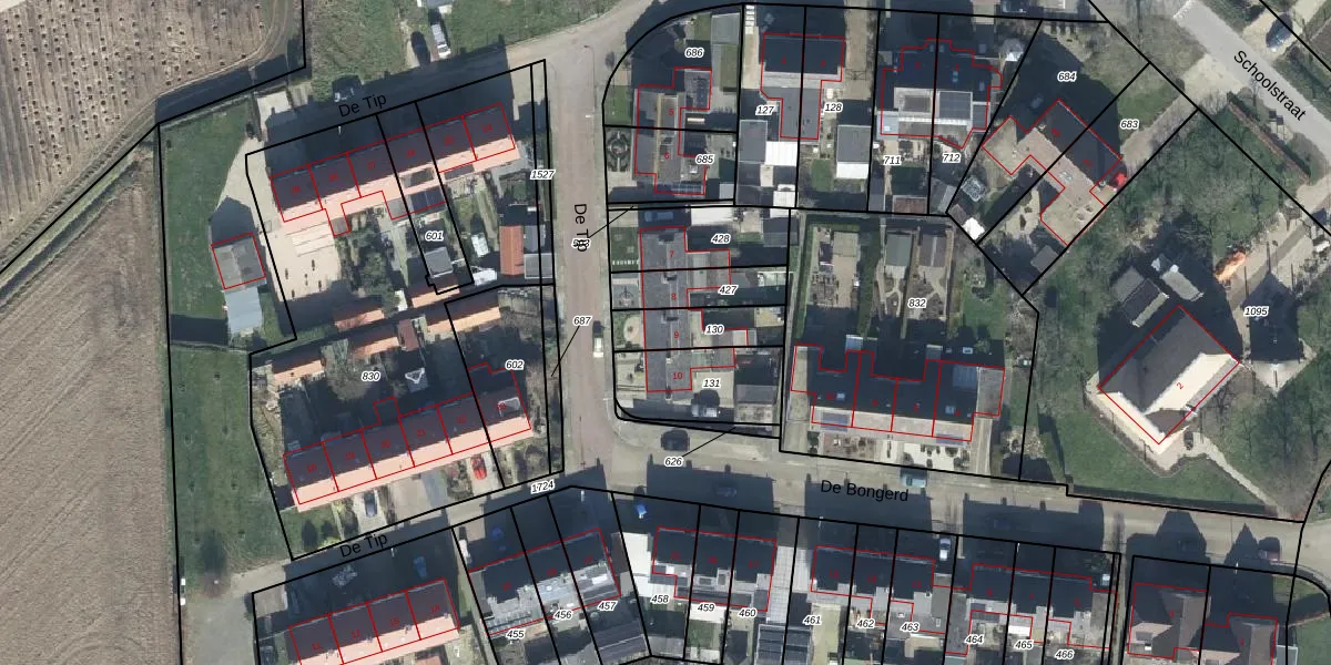 Het perceel waarop De Tip 9 staat heeft een oppervlakte van 157 m². Dit is een middelgroot perceel. De perceeloppervlakte wordt geregistreerd door het Kadaster. Gedetailleerde informatie over de maten van dit perceel kunt u vinden in het rapport Kadastrale kaart met maatvoering van De Tip 9.