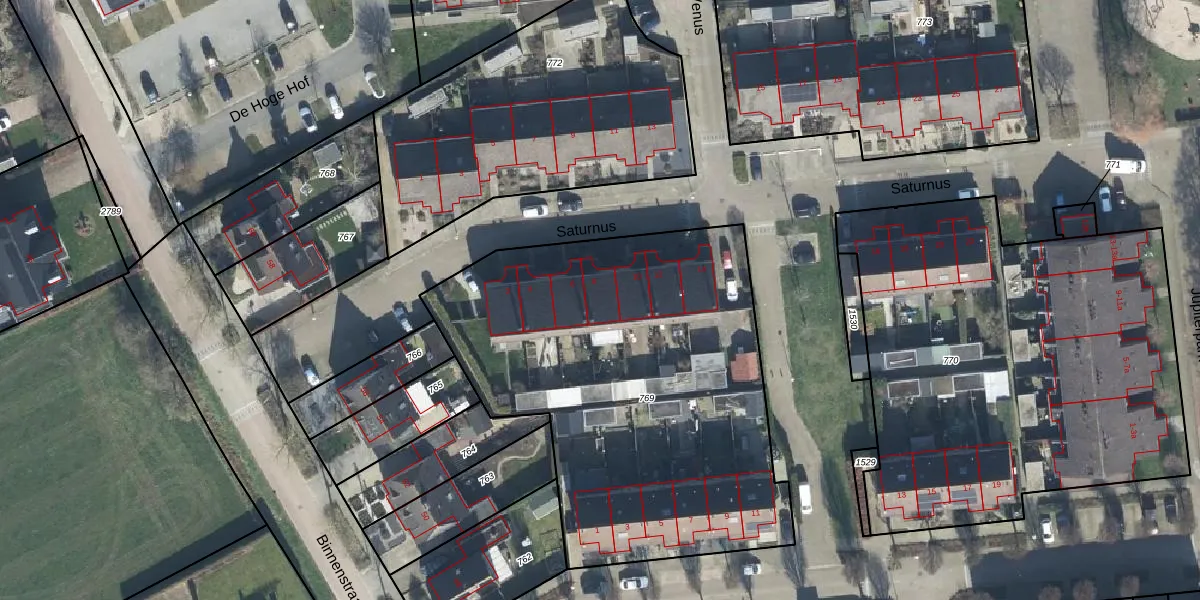 Het perceel waarop Saturnus 8 staat heeft een oppervlakte van 2335 m². Dit is een zeer groot perceel. De perceeloppervlakte wordt geregistreerd door het Kadaster. Gedetailleerde informatie over de maten van dit perceel kunt u vinden in het rapport Kadastrale kaart met maatvoering van Saturnus 8.