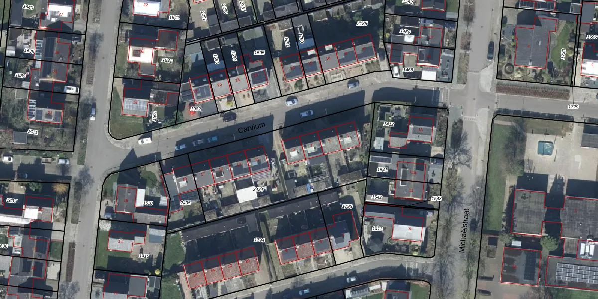 Het perceel waarop Carvium 9 staat heeft een oppervlakte van 1455 m². Dit is een zeer groot perceel. De perceeloppervlakte wordt geregistreerd door het Kadaster. Gedetailleerde informatie over de maten van dit perceel kunt u vinden in het rapport Kadastrale kaart met maatvoering van Carvium 9.