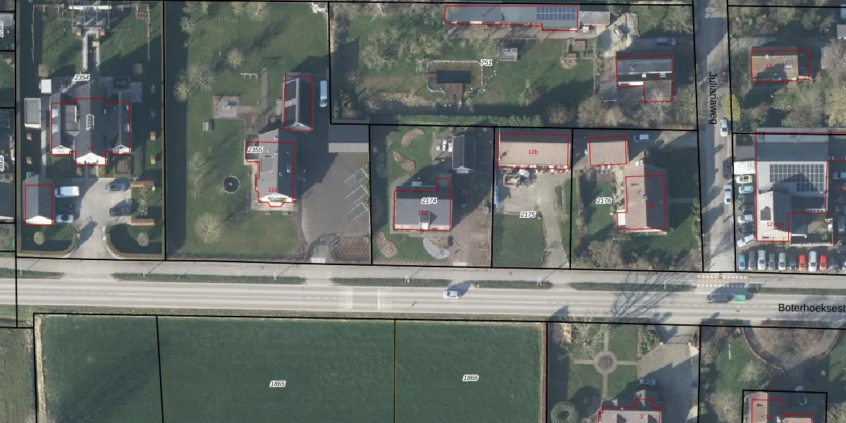 Boterhoeksestraat 12-d is gelegen op kadastraal perceel HTR00C2174. Deze kadastrale aanduiding is uniek en wordt gebruikt door het Kadaster om eigendomsrechten en andere zakelijke rechten vast te leggen. Het perceel maakt onderdeel uit van de kadastrale gemeente Heteren.
