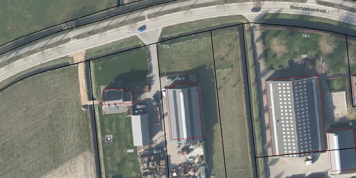 Boterhoeksestraat 15 is gelegen op kadastraal perceel HTR00F1739. Deze kadastrale aanduiding is uniek en wordt gebruikt door het Kadaster om eigendomsrechten en andere zakelijke rechten vast te leggen. Het perceel maakt onderdeel uit van de kadastrale gemeente Heteren.