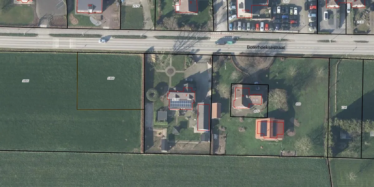 Het perceel waarop Boterhoeksestraat 3 staat heeft een oppervlakte van 1904 m². Dit is een zeer groot perceel. De perceeloppervlakte wordt geregistreerd door het Kadaster. Gedetailleerde informatie over de maten van dit perceel kunt u vinden in het rapport Kadastrale kaart met maatvoering van Boterhoeksestraat 3.