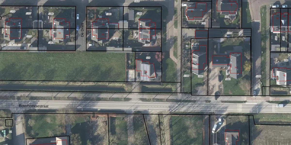 Het perceel waarop Boterhoeksestraat 36 staat heeft een oppervlakte van 385 m². Dit is een groot perceel. De perceeloppervlakte wordt geregistreerd door het Kadaster. Gedetailleerde informatie over de maten van dit perceel kunt u vinden in het rapport Kadastrale kaart met maatvoering van Boterhoeksestraat 36.