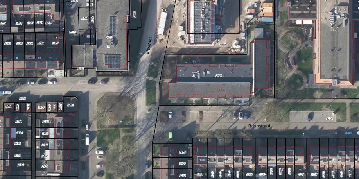 Het perceel waarop Bremstraat 12 staat heeft een oppervlakte van 1995 m². Dit is een zeer groot perceel. De perceeloppervlakte wordt geregistreerd door het Kadaster. Gedetailleerde informatie over de maten van dit perceel kunt u vinden in het rapport Kadastrale kaart met maatvoering van Bremstraat 12.