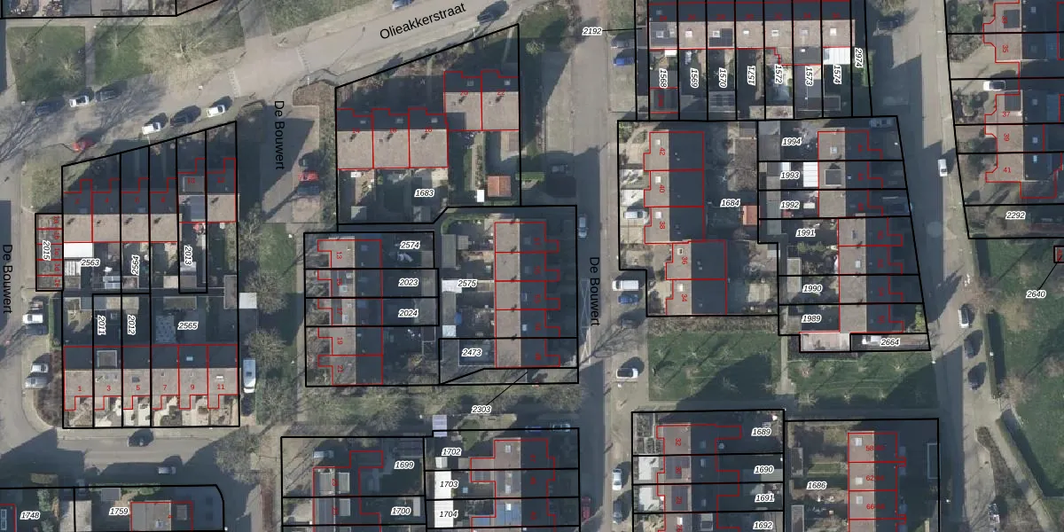 Het perceel waarop De Bouwert 55 staat heeft een oppervlakte van 959 m². Dit is een groot perceel. De perceeloppervlakte wordt geregistreerd door het Kadaster. Gedetailleerde informatie over de maten van dit perceel kunt u vinden in het rapport Kadastrale kaart met maatvoering van De Bouwert 55.