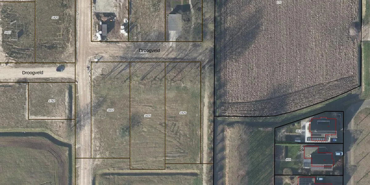 Droogveld 1 is gelegen op kadastraal perceel HTR00F1826. Deze kadastrale aanduiding is uniek en wordt gebruikt door het Kadaster om eigendomsrechten en andere zakelijke rechten vast te leggen. Het perceel maakt onderdeel uit van de kadastrale gemeente Heteren.