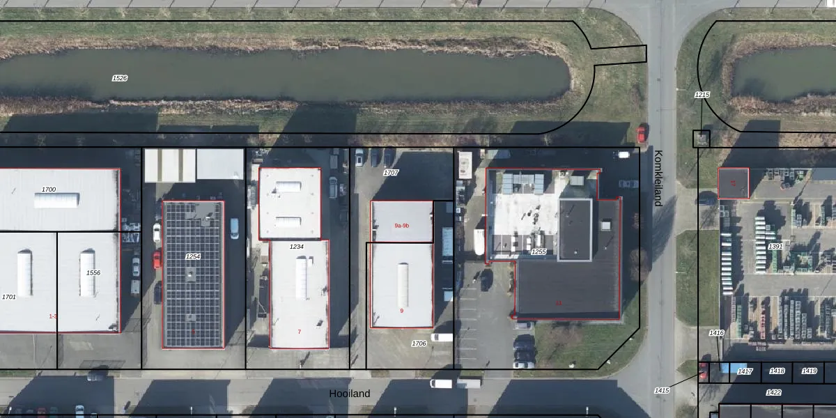 Het perceel waarop Hooiland 9-b staat heeft een oppervlakte van 640 m². Dit is een groot perceel. De perceeloppervlakte wordt geregistreerd door het Kadaster. Gedetailleerde informatie over de maten van dit perceel kunt u vinden in het rapport Kadastrale kaart met maatvoering van Hooiland 9-b.