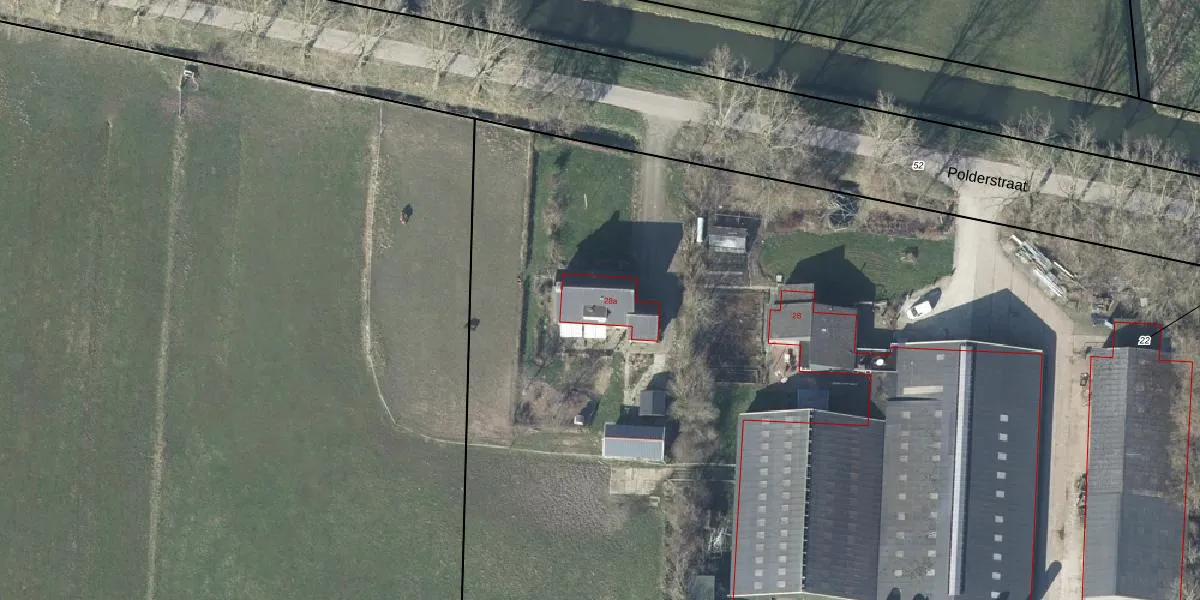 Het perceel waarop Polderstraat 28-a staat heeft een oppervlakte van 7,7 ha. Dit is een zeer groot perceel. De perceeloppervlakte wordt geregistreerd door het Kadaster. Gedetailleerde informatie over de maten van dit perceel kunt u vinden in het rapport Kadastrale kaart met maatvoering van Polderstraat 28-a.