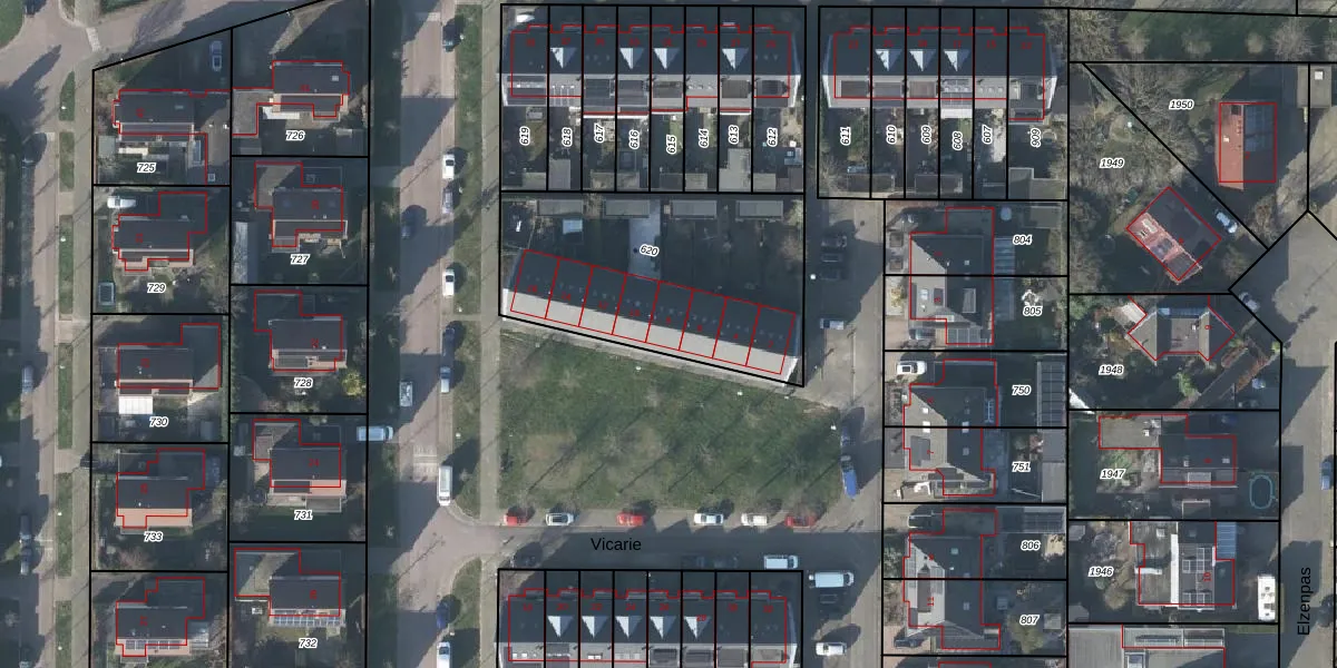 Het perceel waarop Vicarie 8 staat heeft een oppervlakte van 1080 m². Dit is een zeer groot perceel. De perceeloppervlakte wordt geregistreerd door het Kadaster. Gedetailleerde informatie over de maten van dit perceel kunt u vinden in het rapport Kadastrale kaart met maatvoering van Vicarie 8.
