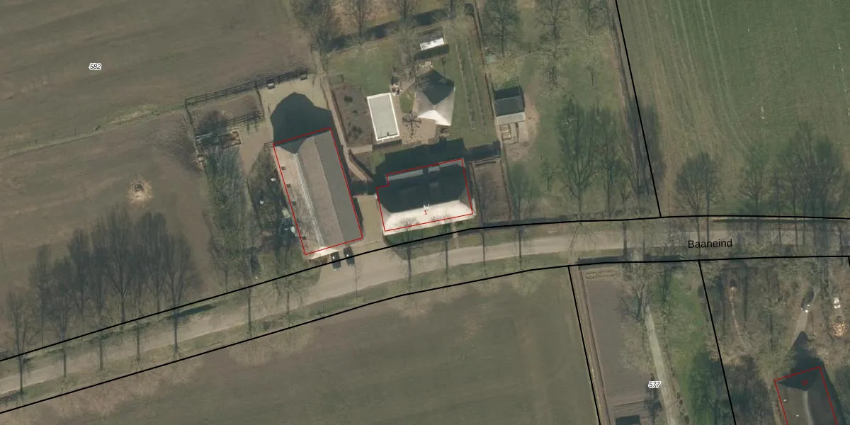 Het perceel waarop Baaneind 1 staat heeft een oppervlakte van 2,9 ha. Dit is een zeer groot perceel. De perceeloppervlakte wordt geregistreerd door het Kadaster. Gedetailleerde informatie over de maten van dit perceel kunt u vinden in het rapport Kadastrale kaart met maatvoering van Baaneind 1.