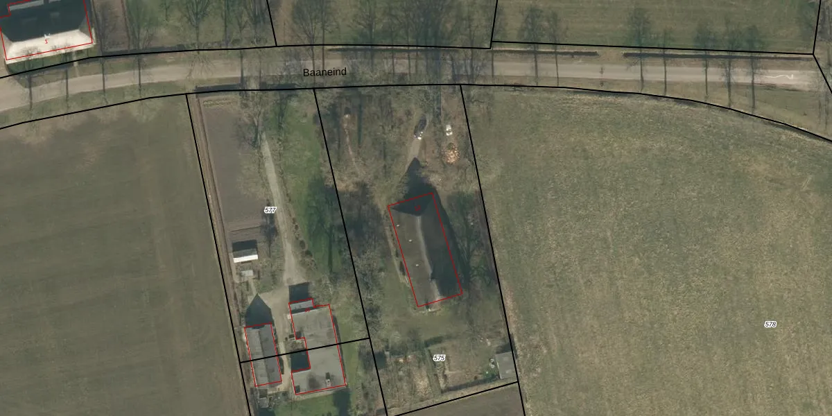 Het perceel waarop Baaneind 12 staat heeft een oppervlakte van 2570 m². Dit is een zeer groot perceel. De perceeloppervlakte wordt geregistreerd door het Kadaster. Gedetailleerde informatie over de maten van dit perceel kunt u vinden in het rapport Kadastrale kaart met maatvoering van Baaneind 12.