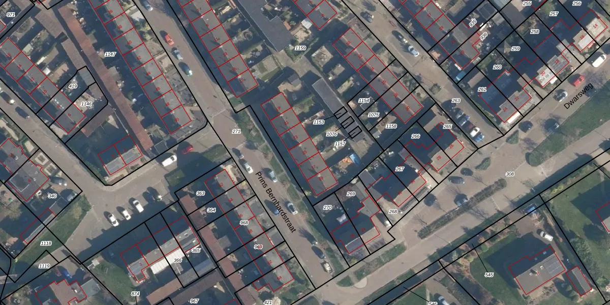 Het perceel waarop Prins Bernhardstraat 25 staat heeft een oppervlakte van 3999 m². Dit is een zeer groot perceel. De perceeloppervlakte wordt geregistreerd door het Kadaster. Gedetailleerde informatie over de maten van dit perceel kunt u vinden in het rapport Kadastrale kaart met maatvoering van Prins Bernhardstraat 25.