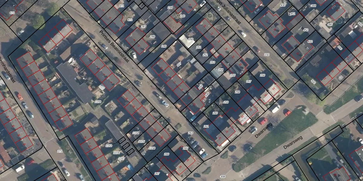 Het perceel waarop Prinses Beatrixstraat 19 staat heeft een oppervlakte van 654 m². Dit is een groot perceel. De perceeloppervlakte wordt geregistreerd door het Kadaster. Gedetailleerde informatie over de maten van dit perceel kunt u vinden in het rapport Kadastrale kaart met maatvoering van Prinses Beatrixstraat 19.