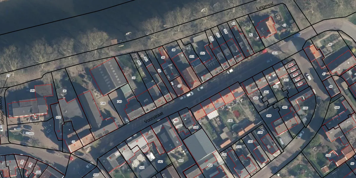 Het perceel waarop Voorstraat 19 staat heeft een oppervlakte van 77 m². Dit is een klein perceel. De perceeloppervlakte wordt geregistreerd door het Kadaster. Gedetailleerde informatie over de maten van dit perceel kunt u vinden in het rapport Kadastrale kaart met maatvoering van Voorstraat 19.