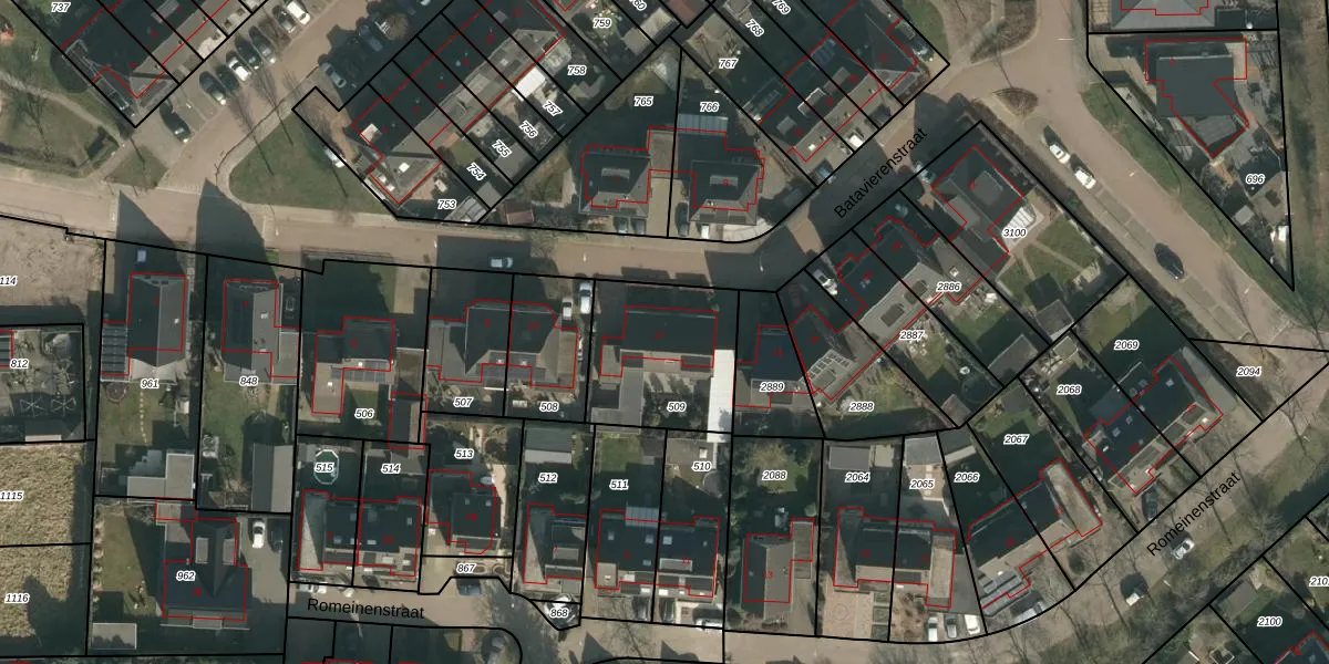 Het perceel waarop Batavierenstraat 12 staat heeft een oppervlakte van 482 m². Dit is een groot perceel. De perceeloppervlakte wordt geregistreerd door het Kadaster. Gedetailleerde informatie over de maten van dit perceel kunt u vinden in het rapport Kadastrale kaart met maatvoering van Batavierenstraat 12.