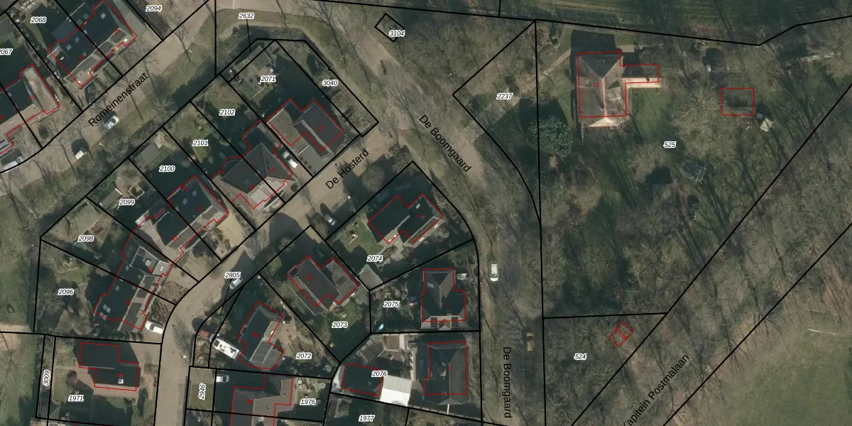 Het perceel waarop De Boomgaard 9 staat heeft een oppervlakte van 545 m². Dit is een groot perceel. De perceeloppervlakte wordt geregistreerd door het Kadaster. Gedetailleerde informatie over de maten van dit perceel kunt u vinden in het rapport Kadastrale kaart met maatvoering van De Boomgaard 9.