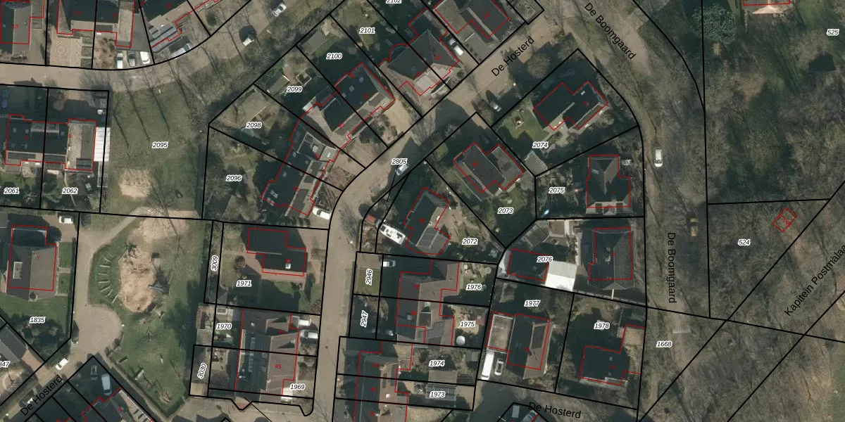 Het perceel waarop De Hosterd 88 staat heeft een oppervlakte van 433 m². Dit is een groot perceel. De perceeloppervlakte wordt geregistreerd door het Kadaster. Gedetailleerde informatie over de maten van dit perceel kunt u vinden in het rapport Kadastrale kaart met maatvoering van De Hosterd 88.