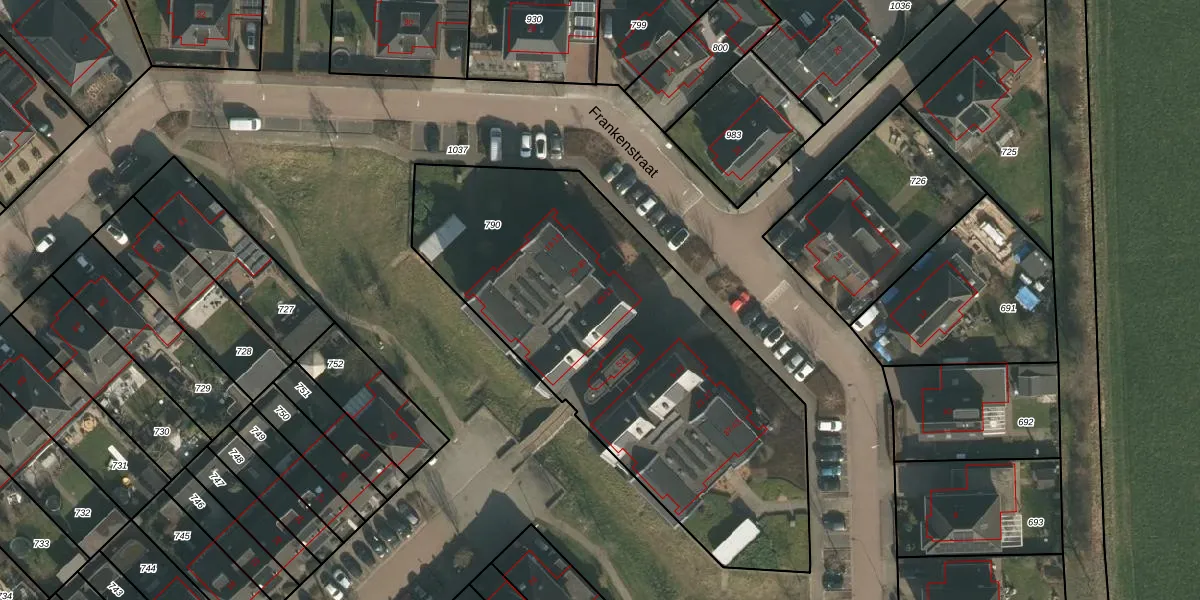 Het perceel waarop Frankenstraat 35 staat heeft een oppervlakte van 2245 m². Dit is een zeer groot perceel. De perceeloppervlakte wordt geregistreerd door het Kadaster. Gedetailleerde informatie over de maten van dit perceel kunt u vinden in het rapport Kadastrale kaart met maatvoering van Frankenstraat 35.
