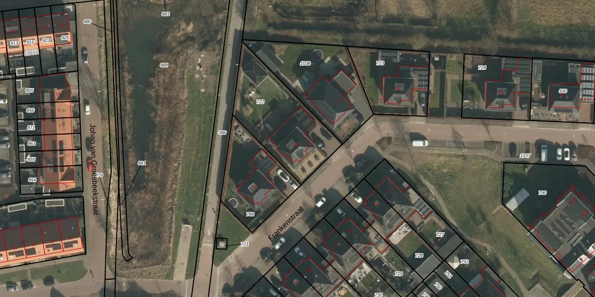 Het perceel waarop Frankenstraat 36 staat heeft een oppervlakte van 793 m². Dit is een groot perceel. De perceeloppervlakte wordt geregistreerd door het Kadaster. Gedetailleerde informatie over de maten van dit perceel kunt u vinden in het rapport Kadastrale kaart met maatvoering van Frankenstraat 36.