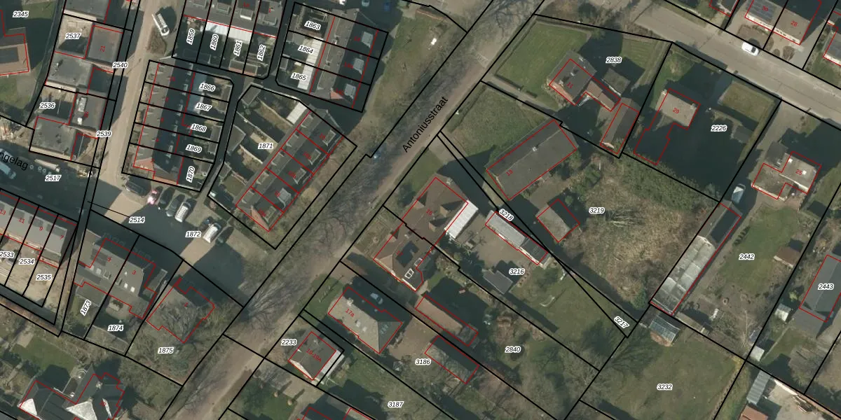 Antoniusstraat 15 is gelegen op kadastraal perceel ATN01E3216. Deze kadastrale aanduiding is uniek en wordt gebruikt door het Kadaster om eigendomsrechten en andere zakelijke rechten vast te leggen. Het perceel maakt onderdeel uit van de kadastrale gemeente Asten.