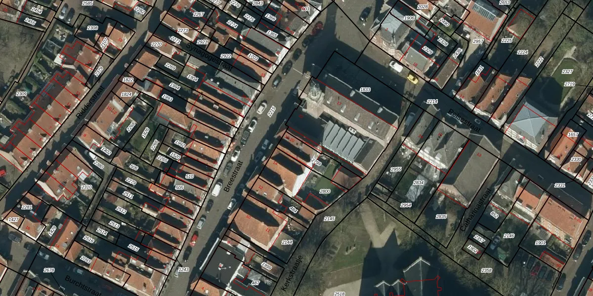 Het perceel waarop Breestraat 18 staat heeft een oppervlakte van 184 m². Dit is een middelgroot perceel. De perceeloppervlakte wordt geregistreerd door het Kadaster. Gedetailleerde informatie over de maten van dit perceel kunt u vinden in het rapport Kadastrale kaart met maatvoering van Breestraat 18.