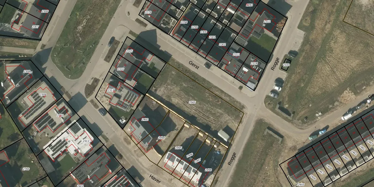 Het perceel waarop Gerst 6 staat heeft een oppervlakte van 1047 m². Dit is een zeer groot perceel. De perceeloppervlakte wordt geregistreerd door het Kadaster. Gedetailleerde informatie over de maten van dit perceel kunt u vinden in het rapport Kadastrale kaart met maatvoering van Gerst 6.