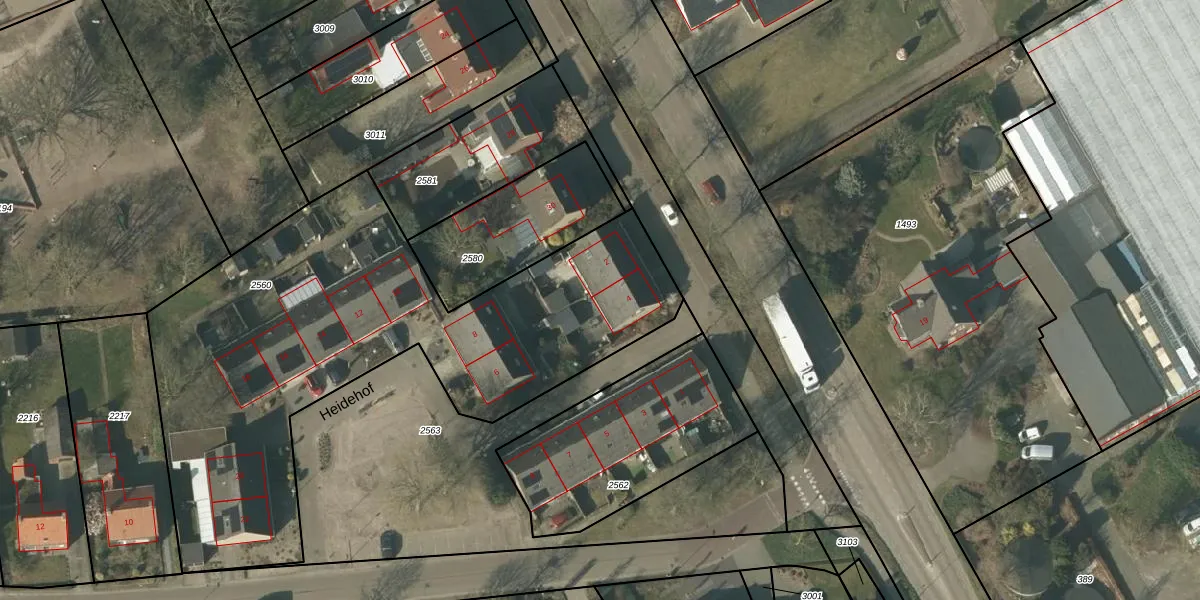 Het perceel waarop Heidehof 4 staat heeft een oppervlakte van 2580 m². Dit is een zeer groot perceel. De perceeloppervlakte wordt geregistreerd door het Kadaster. Gedetailleerde informatie over de maten van dit perceel kunt u vinden in het rapport Kadastrale kaart met maatvoering van Heidehof 4.