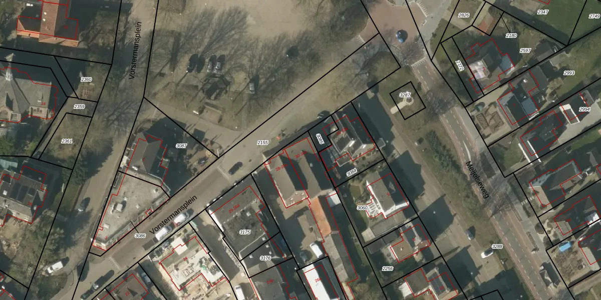Het perceel waarop Vorstermansplein 30 staat heeft een oppervlakte van 1250 m². Dit is een zeer groot perceel. De perceeloppervlakte wordt geregistreerd door het Kadaster. Gedetailleerde informatie over de maten van dit perceel kunt u vinden in het rapport Kadastrale kaart met maatvoering van Vorstermansplein 30.