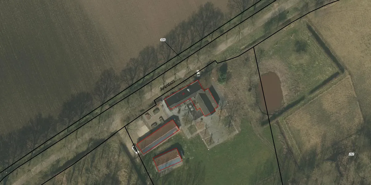 Het perceel waarop Arenbos 15 staat heeft een oppervlakte van 2,5 ha. Dit is een zeer groot perceel. De perceeloppervlakte wordt geregistreerd door het Kadaster. Gedetailleerde informatie over de maten van dit perceel kunt u vinden in het rapport Kadastrale kaart met maatvoering van Arenbos 15.