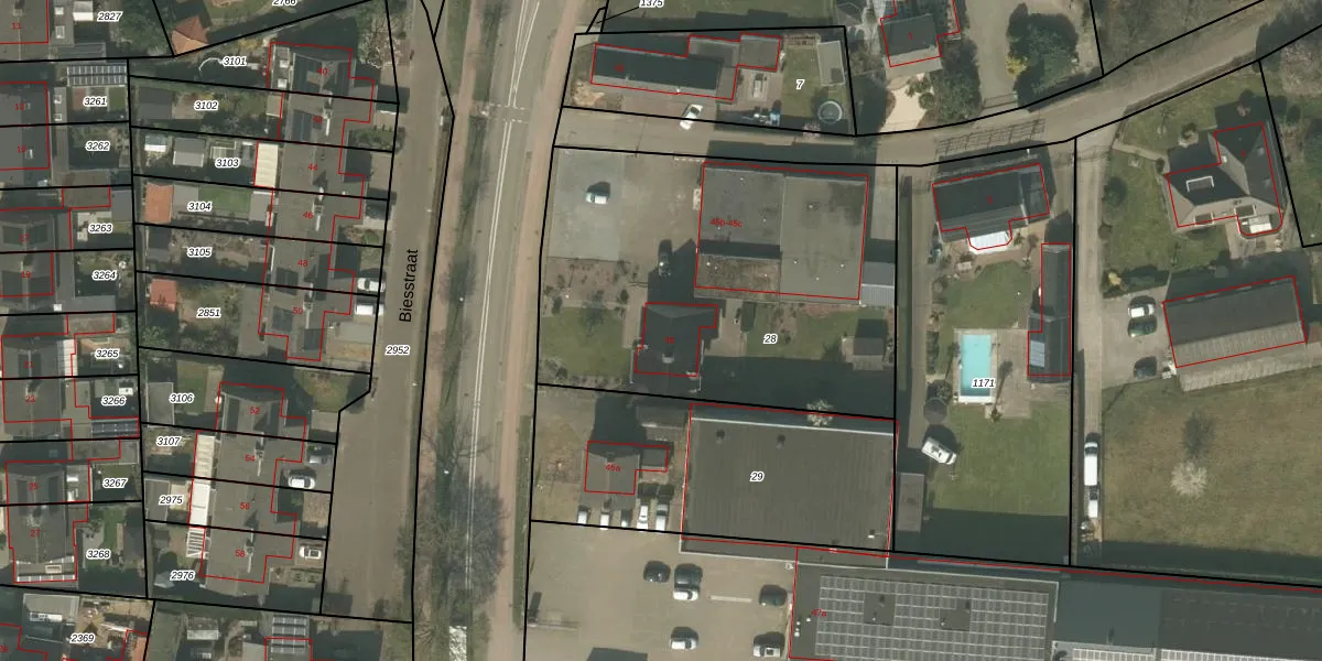 Biesstraat 45 is gelegen op kadastraal perceel HHS00N28. Deze kadastrale aanduiding is uniek en wordt gebruikt door het Kadaster om eigendomsrechten en andere zakelijke rechten vast te leggen. Het perceel maakt onderdeel uit van de kadastrale gemeente Heythuysen.
