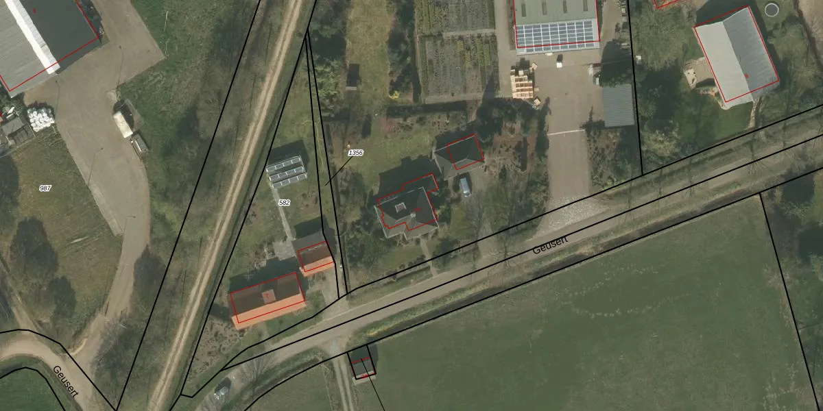 Het perceel waarop Geusert 7-a staat heeft een oppervlakte van 1,3 ha. Dit is een zeer groot perceel. De perceeloppervlakte wordt geregistreerd door het Kadaster. Gedetailleerde informatie over de maten van dit perceel kunt u vinden in het rapport Kadastrale kaart met maatvoering van Geusert 7-a.