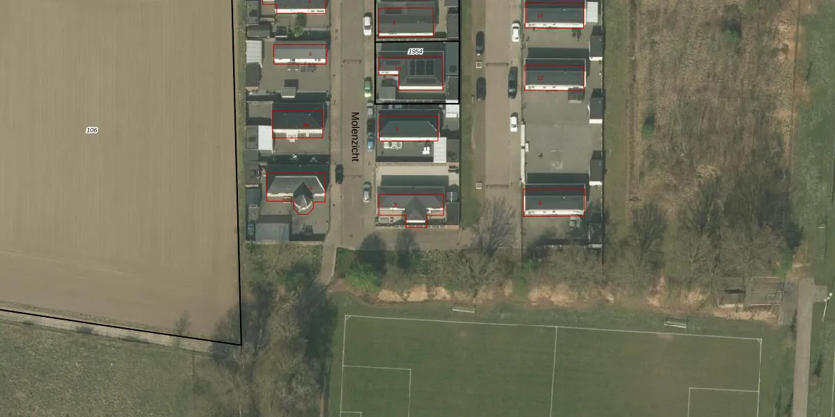 Het perceel waarop Molenzicht 5 staat heeft een oppervlakte van 13,3 ha. Dit is een zeer groot perceel. De perceeloppervlakte wordt geregistreerd door het Kadaster. Gedetailleerde informatie over de maten van dit perceel kunt u vinden in het rapport Kadastrale kaart met maatvoering van Molenzicht 5.