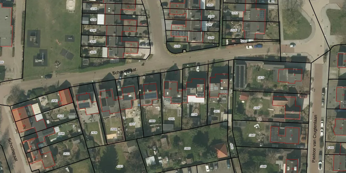 Het perceel waarop Schoolstraat 30 staat heeft een oppervlakte van 422 m². Dit is een groot perceel. De perceeloppervlakte wordt geregistreerd door het Kadaster. Gedetailleerde informatie over de maten van dit perceel kunt u vinden in het rapport Kadastrale kaart met maatvoering van Schoolstraat 30.