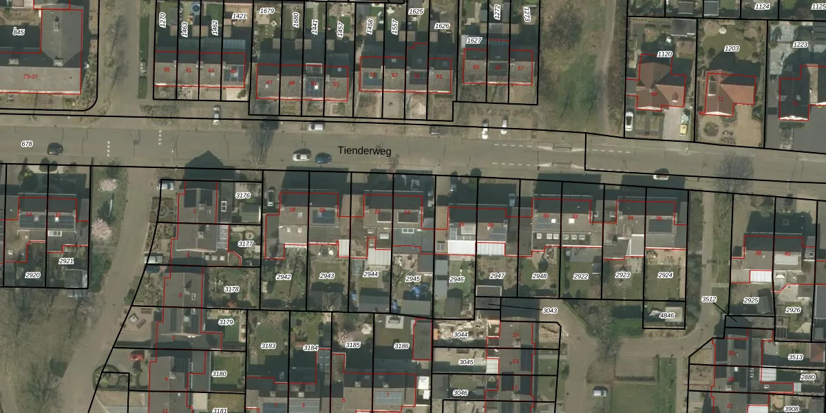 Het perceel waarop Tienderweg 24 staat heeft een oppervlakte van 353 m². Dit is een groot perceel. De perceeloppervlakte wordt geregistreerd door het Kadaster. Gedetailleerde informatie over de maten van dit perceel kunt u vinden in het rapport Kadastrale kaart met maatvoering van Tienderweg 24.