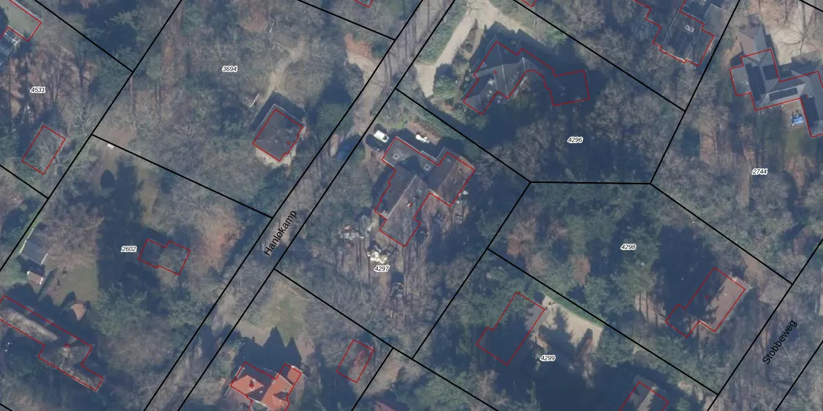 Het perceel waarop Hanlokamp 2 staat heeft een oppervlakte van 2100 m². Dit is een zeer groot perceel. De perceeloppervlakte wordt geregistreerd door het Kadaster. Gedetailleerde informatie over de maten van dit perceel kunt u vinden in het rapport Kadastrale kaart met maatvoering van Hanlokamp 2.