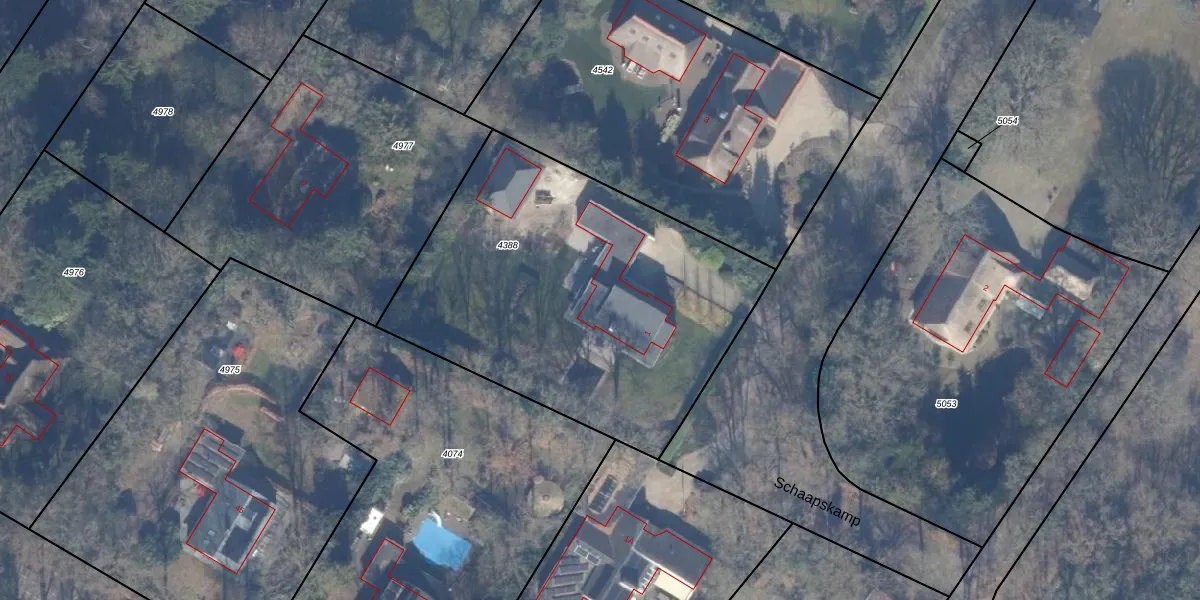 Het perceel waarop Schaapskamp 1 staat heeft een oppervlakte van 1927 m². Dit is een zeer groot perceel. De perceeloppervlakte wordt geregistreerd door het Kadaster. Gedetailleerde informatie over de maten van dit perceel kunt u vinden in het rapport Kadastrale kaart met maatvoering van Schaapskamp 1.
