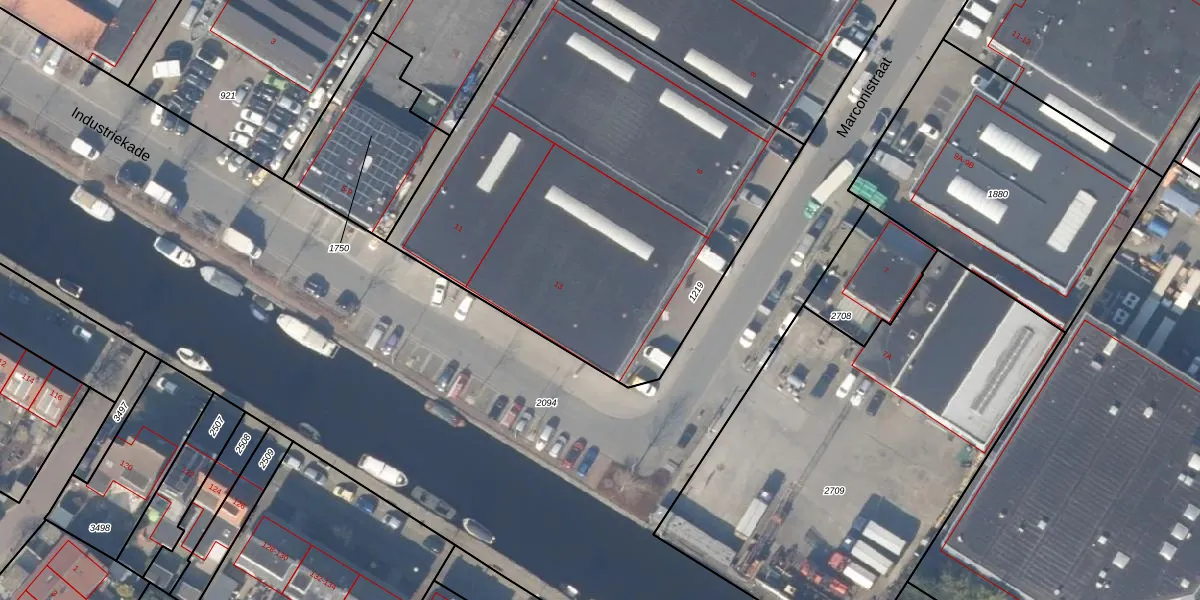 Het perceel waarop Industriekade 13 staat heeft een oppervlakte van 2560 m². Dit is een zeer groot perceel. De perceeloppervlakte wordt geregistreerd door het Kadaster. Gedetailleerde informatie over de maten van dit perceel kunt u vinden in het rapport Kadastrale kaart met maatvoering van Industriekade 13.