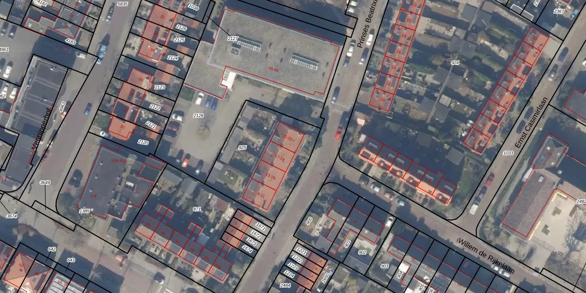 Het perceel waarop Prinses Beatrixlaan 21 staat heeft een oppervlakte van 960 m². Dit is een groot perceel. De perceeloppervlakte wordt geregistreerd door het Kadaster. Gedetailleerde informatie over de maten van dit perceel kunt u vinden in het rapport Kadastrale kaart met maatvoering van Prinses Beatrixlaan 21.